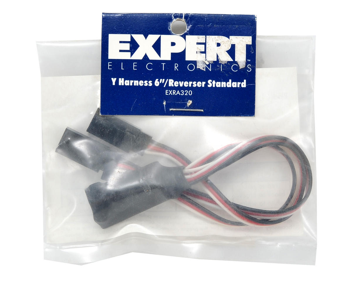 This is a Expert Electronics 6" Standard Y-Harness with Reverser from Expert Electronics. This cable features a "reverser" that reverses the pulses to one servo so it will go backwards. This is useful in landing gear or flap applications when you only need to reverse the direction of one servo. These are made with thick, high quality wire for maximum current carrying capacity and strength. The standard plugs on these are similar to the JR and Airtronics Z connectors, and will work with any radio system. The female end is designed to also accept Futaba connectors, as well as JR, Aitronics and HiTec connectors..