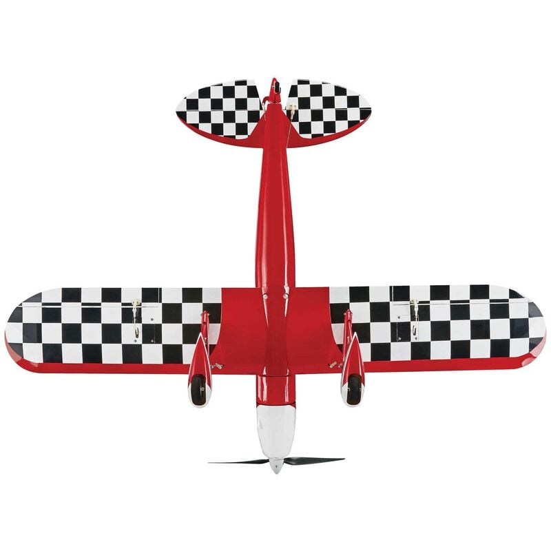 The eye-catching trim scheme reproduces the full-scale Ryan STA’s, down to the checkerboard design on the bottom of the wing.